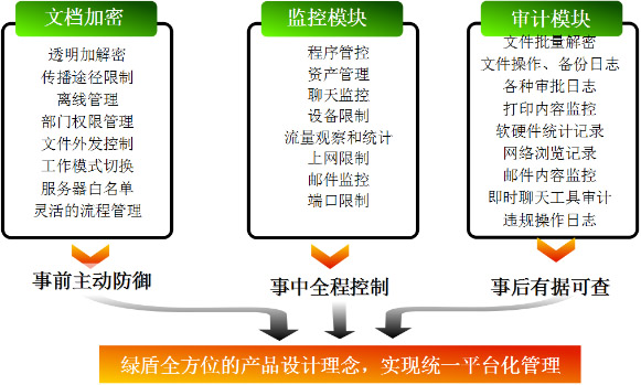 1、强制、自动、透明加密电子文档,防止第一作者泄密 2、设置文档阅读权限,防止越权读取 3、自动备份加密文档,防止恶意删除 4、三重密钥管理,安全可靠 5、灵活离线策略,在方便员工短期外出、在家办公或长期出差的同时,防泄密 6、在线解密申请,授权高管解密后方可文件外发 7、外发文件控制,可设置外发文件的阅读次数,阅读天数,是否需要密码等设置,保证文档安全 8、分组管理功能,保持部门间的相对独立 9、打印目录及内容记录 10、支持liunx版本 11.支持苹果Mac Os X版本 12、支持手机端解密(另付费)