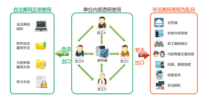 1、强制、自动、透明加密电子文档,防止第一作者泄密 2、设置文档阅读权限,防止越权读取 3、自动备份加密文档,防止恶意删除 4、三重密钥管理,安全可靠 5、灵活离线策略,在方便员工短期外出、在家办公或长期出差的同时,防泄密 6、在线解密申请,授权高管解密后方可文件外发 7、外发文件控制,可设置外发文件的阅读次数,阅读天数,是否需要密码等设置,保证文档安全 8、分组管理功能,保持部门间的相对独立 9、打印目录及内容记录 10、支持liunx版本 11.支持苹果Mac Os X版本 12、支持手机端解密(另付费)